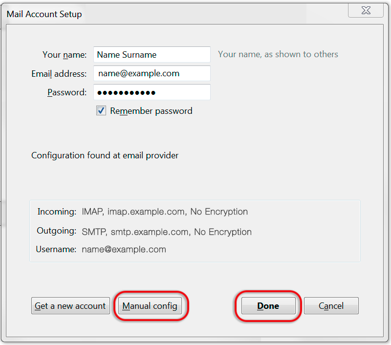 - If your settings are found, then your setup is complete and you can press Done. If your settings are not found, click the Manual config button and continue as below